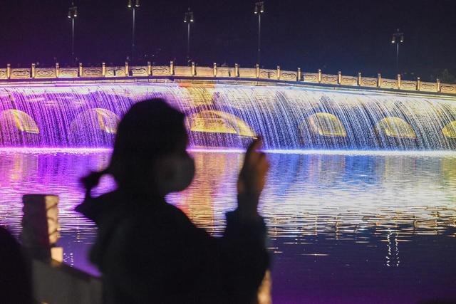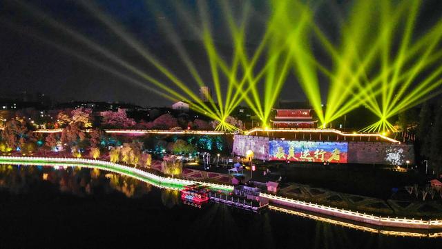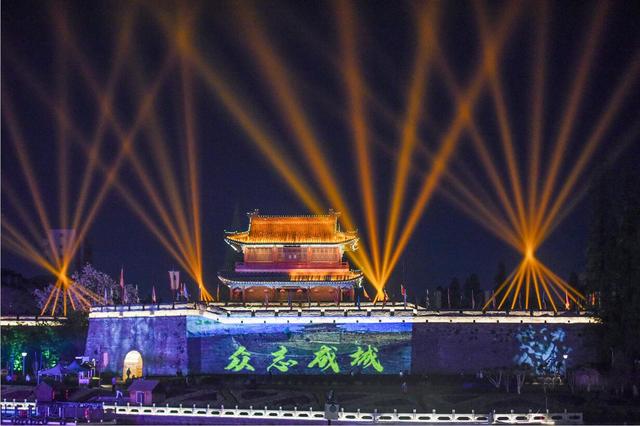 湖北荆州古城东门景区光影秀是一项旨在丰富市民夜生活的公益灯光秀,常规演出为每天夜间表演两场。疫情发生后,该光影秀关闭停运。随着疫情形势的持续向好,市民生活秩序逐渐恢复正常,该光影秀根据当前疫情形势重新启动,并加入了致敬最美逆行者和抗疫英雄等主题元素。黄志刚/图片
