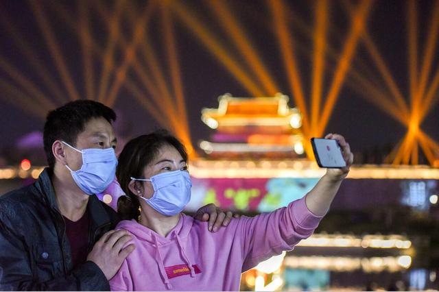 2020年4月8日夜,湖北荆州古城东门景区光影秀恢复表演,市民在现场有序观看。